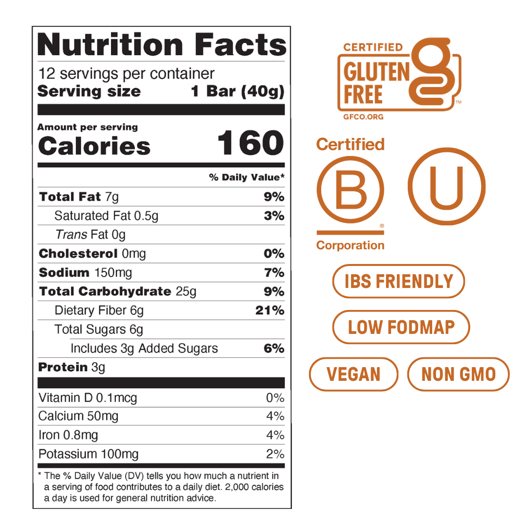 Découvrez l'équilibre parfait entre sucré et salé avec notre barre snack au caramel salé. Cette délicieuse barre combine les saveurs riches des dattes, des amandes et des noix de pécan avec une touche de sirop d'érable et de sel marin, le tout enveloppé dans un mélange sain d'avoine, de riz brun croustillant et de quinoa soufflé. Enrichi en fibres prébiotiques, c'est un en-cas satisfaisant, adapté aux personnes souffrant du syndrome du côlon irritable et très savoureux. Fabriqué à partir de fibres douces pour favoriser la régularité et la santé intestinale en général.