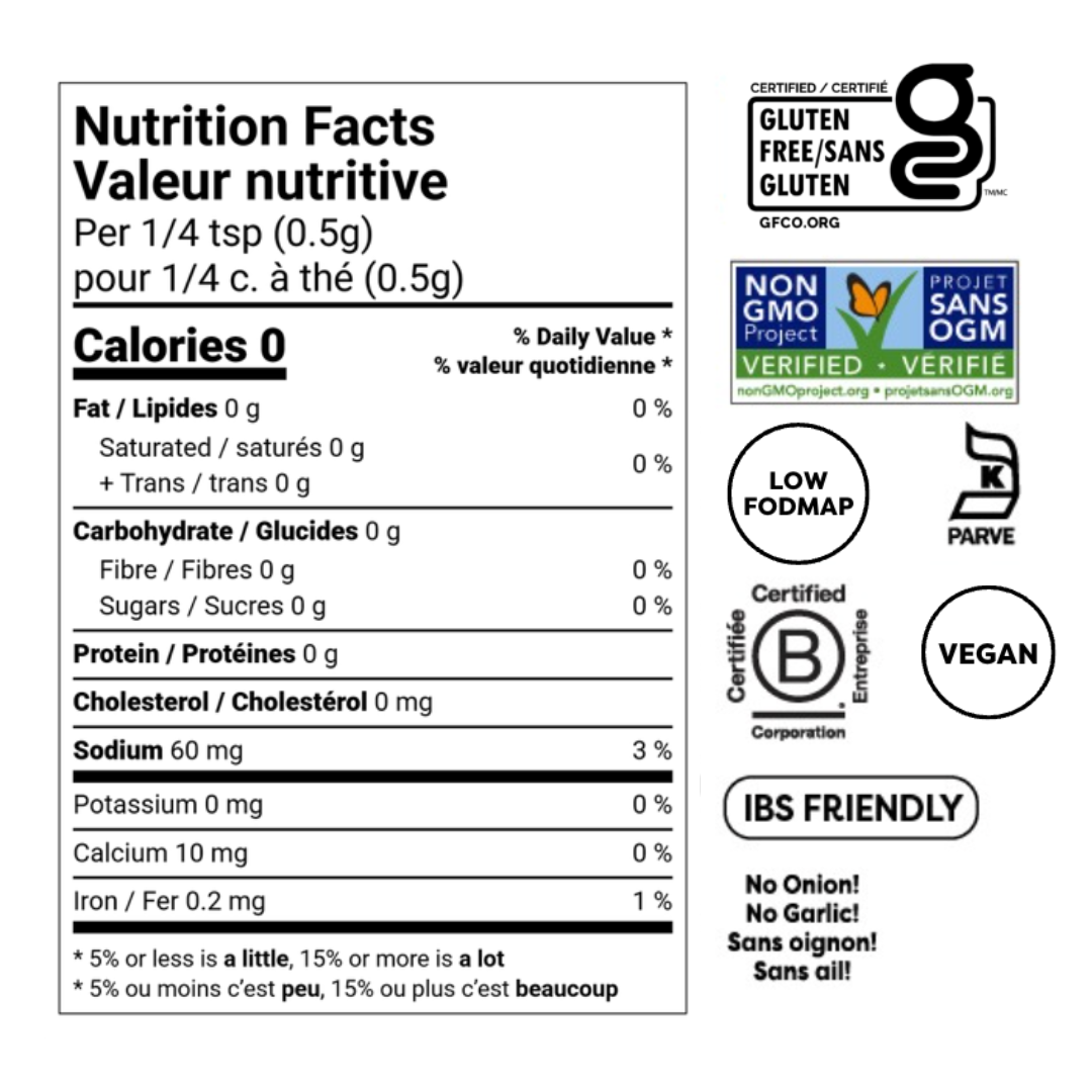 Ajoutez une touche de fraîcheur à vos repas grâce à notre assaisonnement au citron et aux herbes, adapté aux personnes souffrant du syndrome du côlon irritable. Ce mélange vibrant et savoureux rehaussera toutes vos recettes. Soigneusement élaboré sans oignon ni ail, il est faible en FODMAP, sans gluten et sans OGM, ce qui le rend idéal pour les estomacs sensibles. Riche en saveurs acidulées de citron et d'herbes aromatiques, il est parfait pour rehausser vos plats quotidiens.